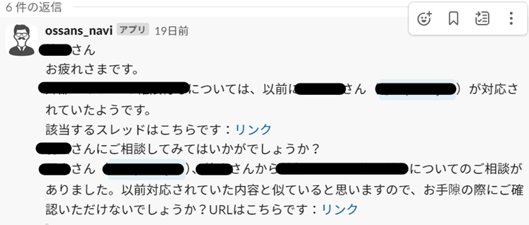 質問者が誰に聞けばいいか分からない時、おっさんずナビが自動的に適切な人を見つけてメンションします。