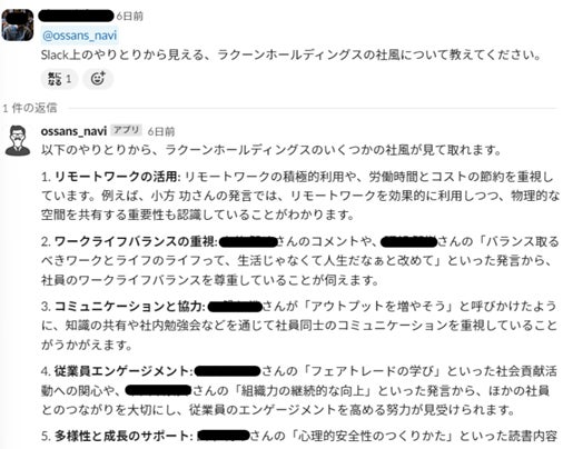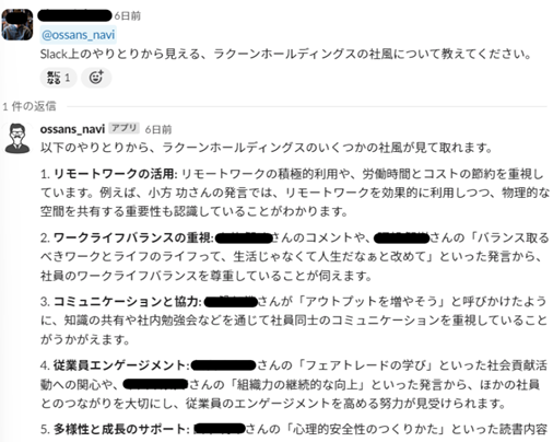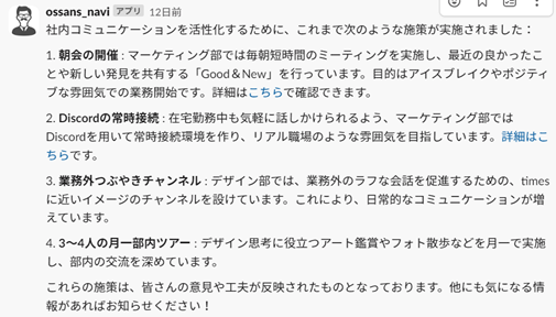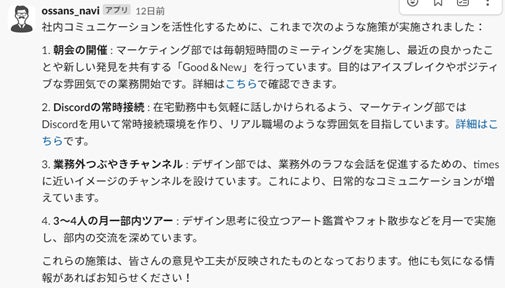 ② 社内の固有の知識・情報をもとに、過去の事例を踏まえた社内施策などの壁打ちがSlack上で簡単にできる
