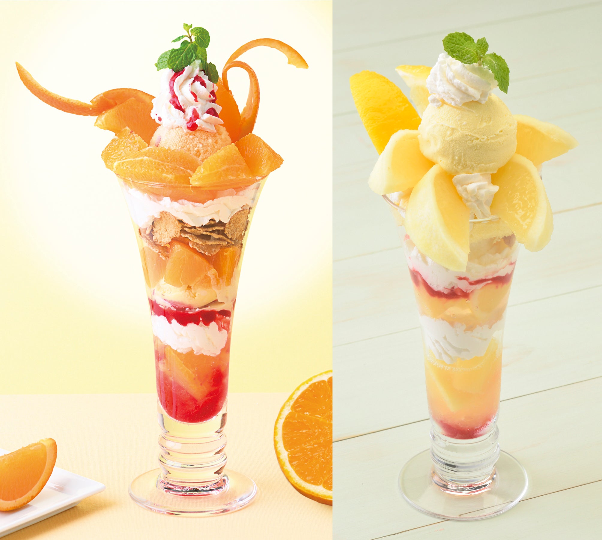 どちらも1個分の果肉を贅沢に使用し、自家製グラニテ(※)、バニラアイス&ホイップクリームを層にして重ね、ボリューム満点に仕上げました。