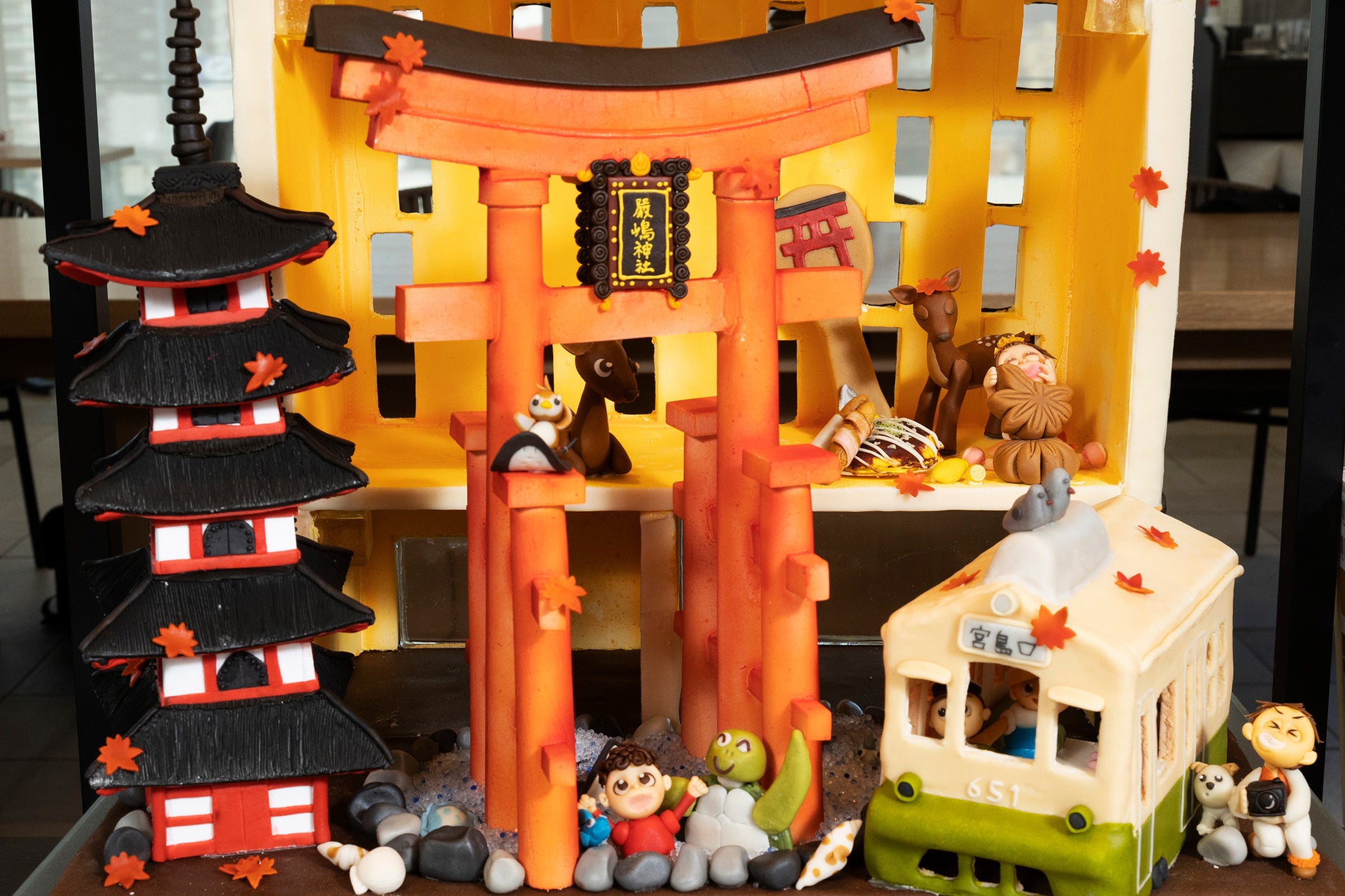 製菓技術強化クラブに所属する製菓衛生師科2年生の学生10名が参加し、「広島の魅力発信」をテーマに、デザインを考案。世界遺産・日本三景の「宮島」や広電(ひろでん)の愛称で地元の人から親しまれている広島電鉄の「路面電車」のほか、広島ならではの名産品を細かな部分までお菓子(シュガーデコレーションやマジパン)で表現しております。本作品は、ホテル最上階のインターゲートラウンジ(14階)に展示し、どなたでもご鑑賞いただけます。学生が手掛けた広島の魅力あふれる作品をぜひご覧ください。