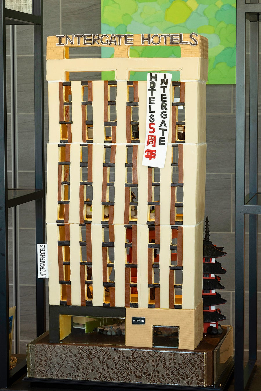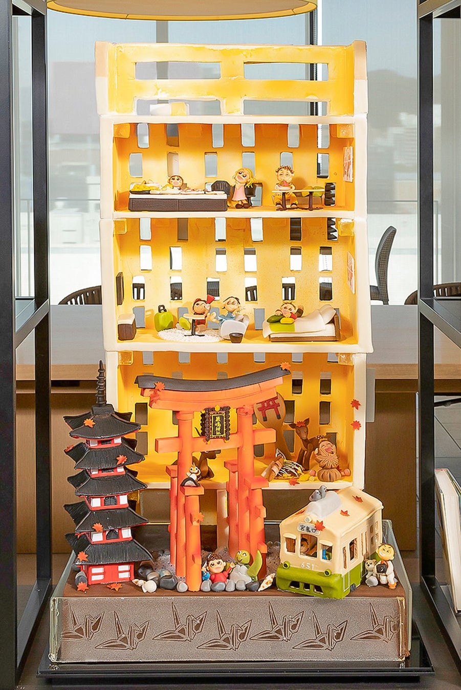 『広島の魅力を一目で、お菓子で伝えたい』 という想いから、「広島らしさ」についてディスカッションを行い、デザインを出し合いました。ホテル外観や宮島の鳥居・五重塔、路面電車といった大きなパーツはシュガーデコレーション、お部屋やビュッフェの様子といった細かなパーツはマジパンで制作しています。作業を分担して少しずつ組み上げ、広島の魅力いっぱいの大きな作品が完成し、私たちも広島の魅力を再発見することができました。五重塔など建築物の細部、路面電車のフォルム、マジパン細工で作った人形の表情や広島食材のリアルさを、ぜひご覧ください!
