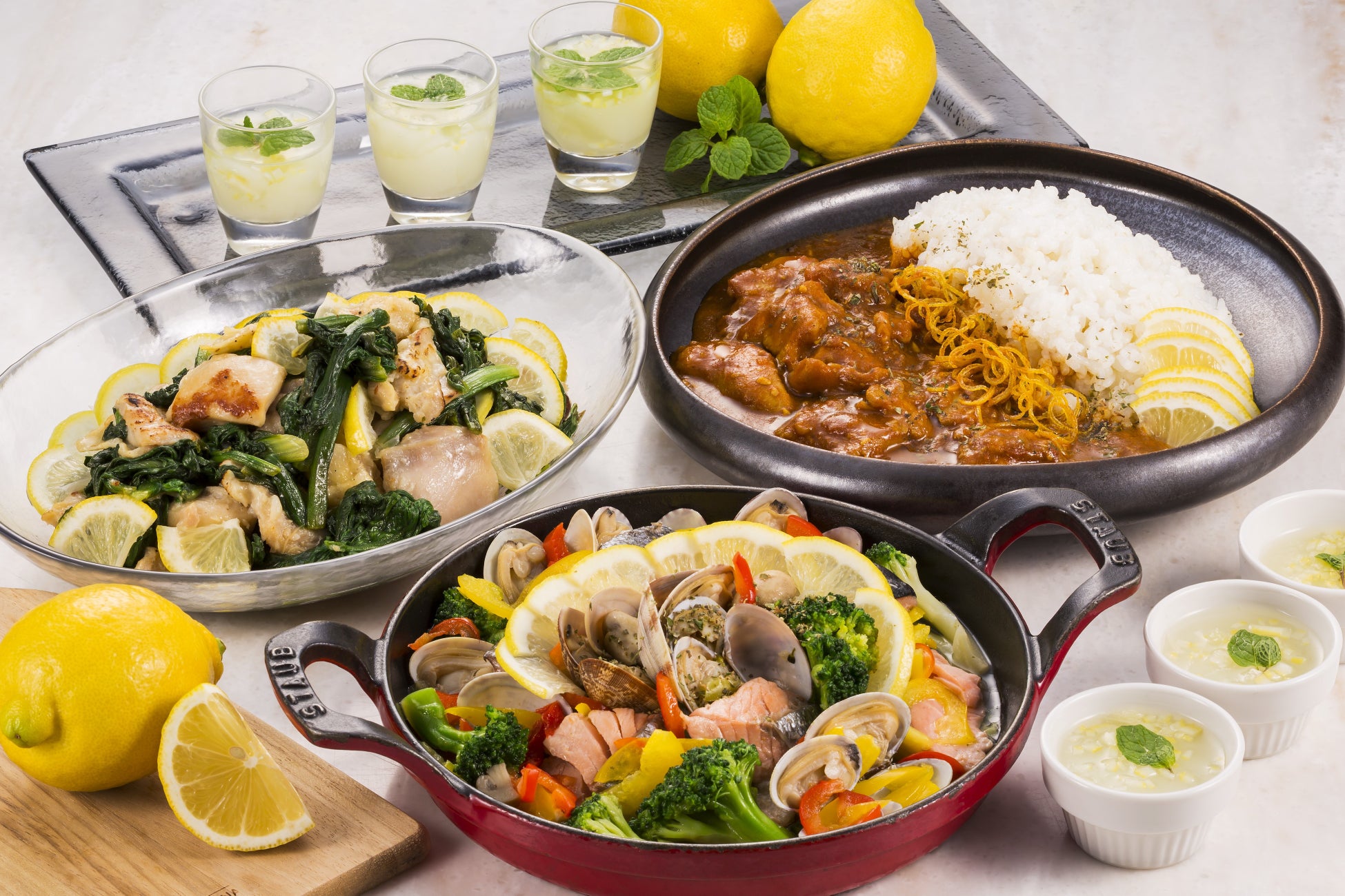 メニュー名:レモチキカレー / 広島県産レモンの香るアクアパッツァ / レモンチキンと春菊のマリアージュ / チー坊ゼリー 料研特製レモンまるごとソース