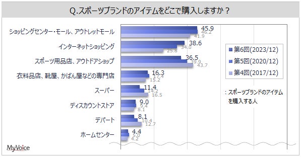 スポーツブランドのアイテムを「インターネットショッピング」で購入する人は増加傾向、「スポーツ用品店、アウトドアショップ」は減少傾向