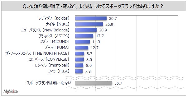 スポーツブランドを身につける人は64%です。よく身につけるブランドは(複数回答)、「アディダス」が30.7%、「ナイキ」「ニューバランス」が各20%台です。