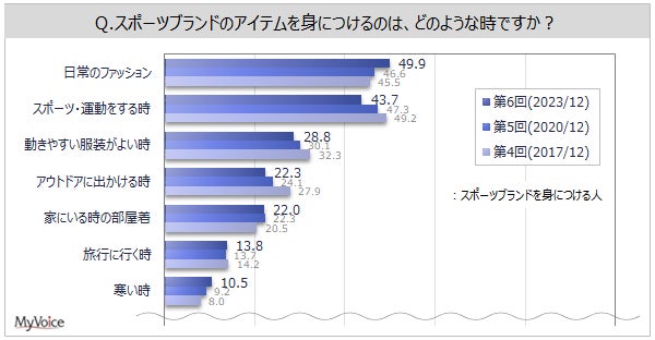 スポーツブランドを身につける人に、どのような時に身につけるかを聞きました(複数回答)。