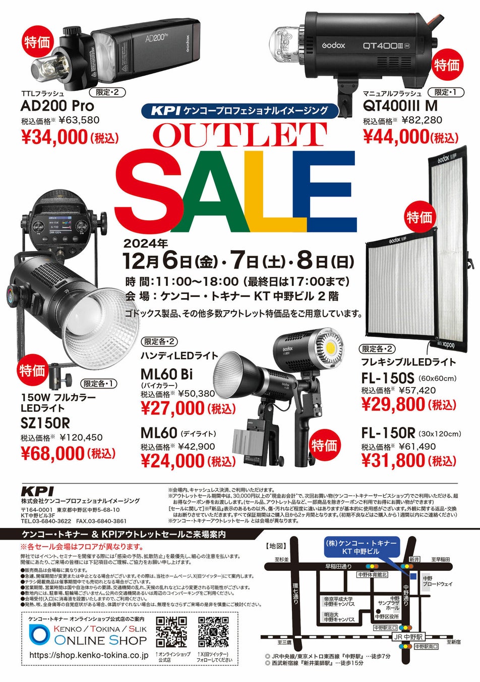 株式会社ケンコー・トキナー(本社:東京都中野区 代表取締役社長 山中 徹)は、株式会社ケンコープロフェショナルイメージングと合同で、ケンコー・トキナーKT 中野ビル(東京都中野区中野5-68-10)にて、アウトレットセールを2024年12月6日(金)~8日(日)に開催いたします。(6日はケンコープロフェショナルイメージングのみ開催)ケンコー・トキナーでは、トキナーレンズアウトレットをはじめ、多くの製品を取り揃えます。