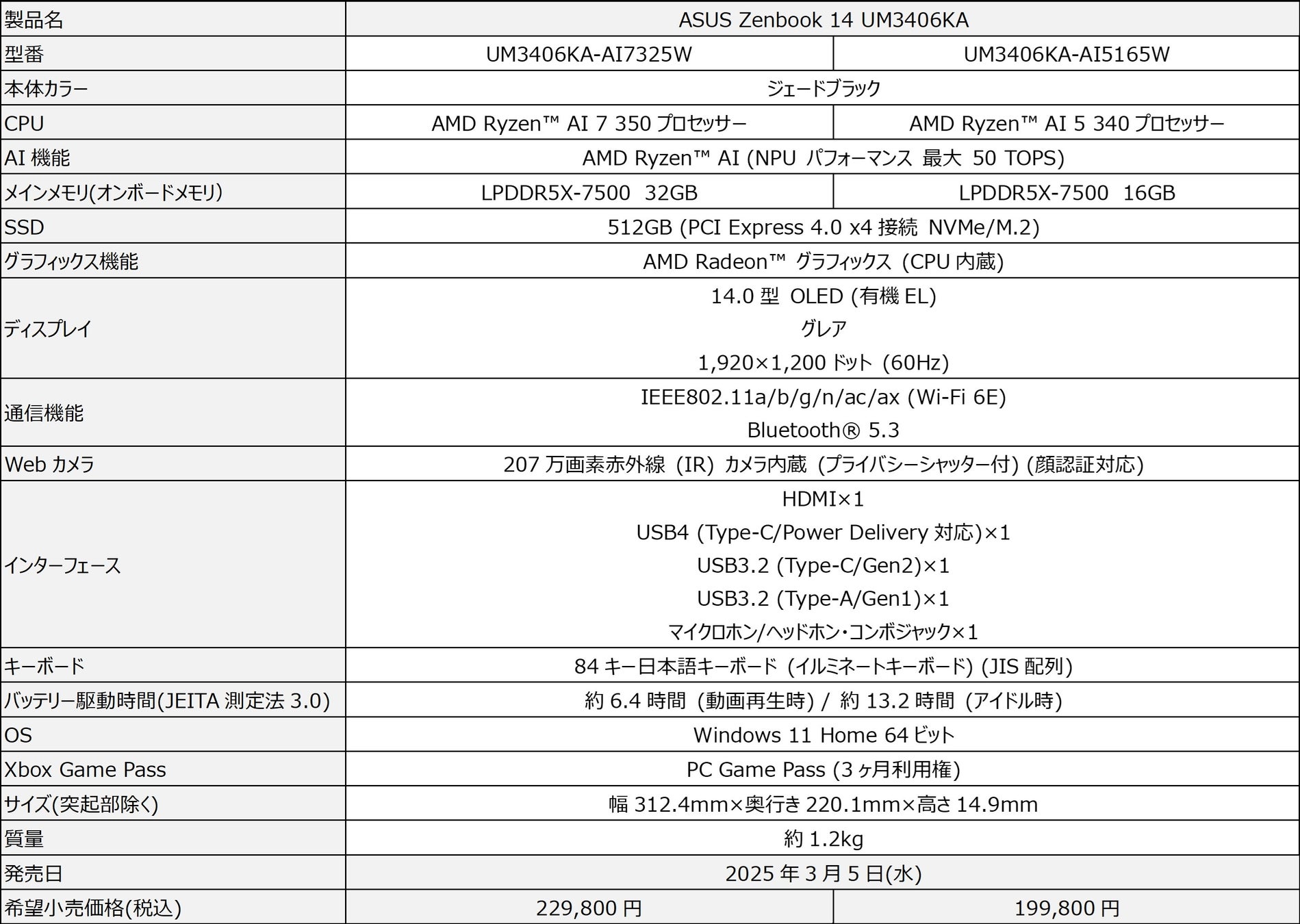 「ASUS Zenbook 14 UM3406KA」は最新のAMD Ryzen™ AI 7 350プロセッサー、または、AMD Ryzen™ AI 5 340プロセッサーを搭載した14型ノートPCし、NPUにはAMD Ryzen™ AIを内蔵し、最大50TOPSと圧倒的なAIパフォーマンスを発揮するASUSのCopilot+ PCです。