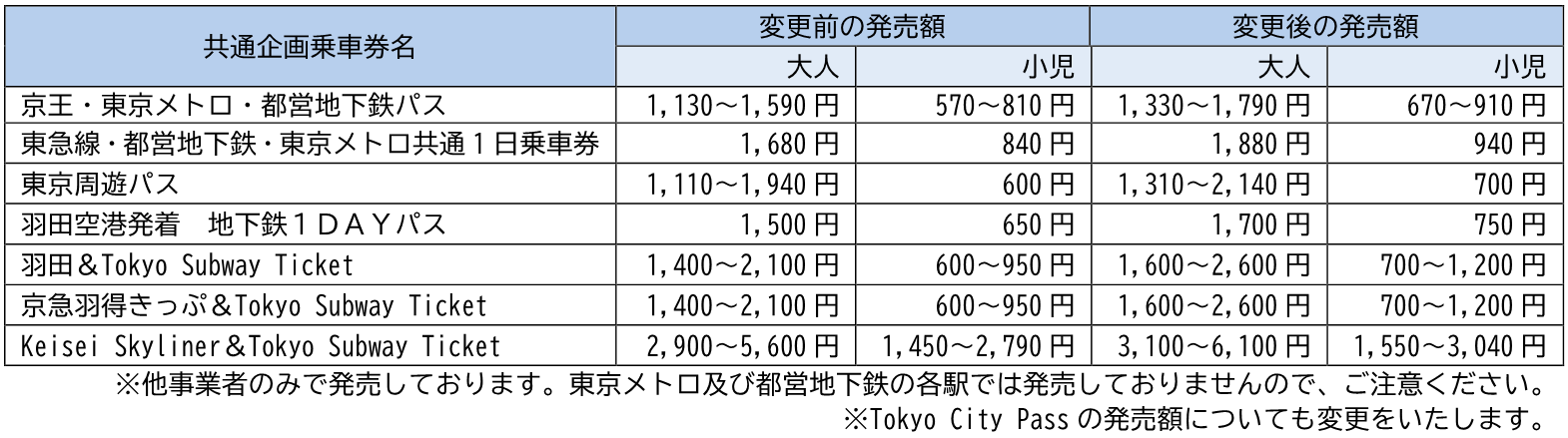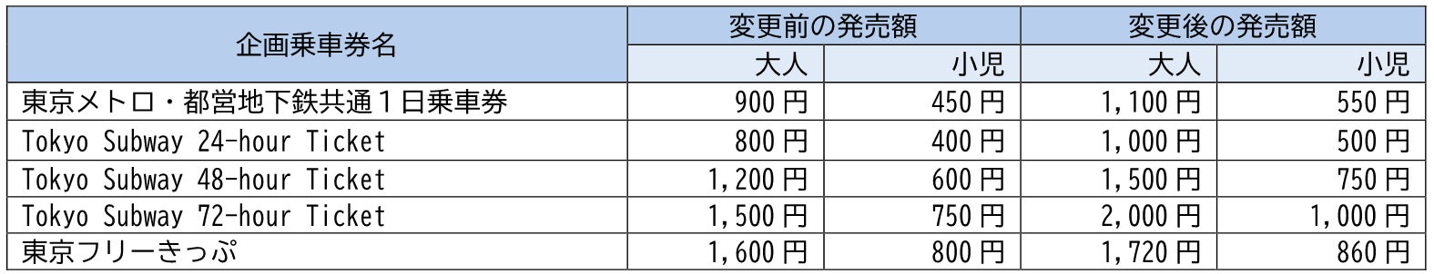 企画乗車券「東京メトロ・都営地下鉄共通1日乗車券」「Tokyo Subway Ticket」「東京フリーきっぷ」及び他事業者との共通企画乗車券の発売額変更について