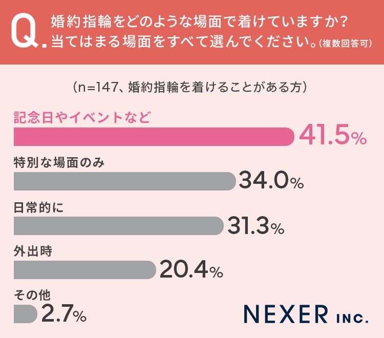 41.5%と半数近くの方が「記念日やイベントなど」で婚約指輪を着けることがある、と回答しています。