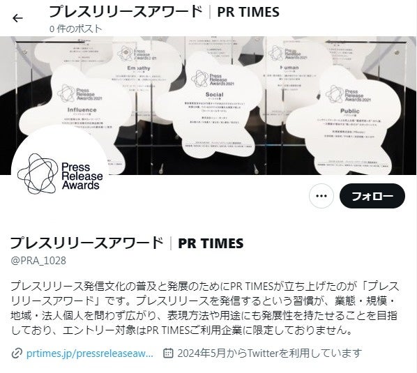 この度「プレスリリースアワード2024」開催に向けて、公式Xアカウントおよび公式Facebookアカウントを開設しました。「プレスリリースアワード」に関する審査のポイントを解説するセミナー情報や、当アワードにまつわるお役立ち情報を発信していく予定です。