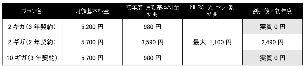 ※1年間実質0円となるのは、2ギガ(3年契約)または10ギガ(3年契約)プランに、初年度の月額基本料金が980円となる新規入会特典と本特典とを併用した場合。