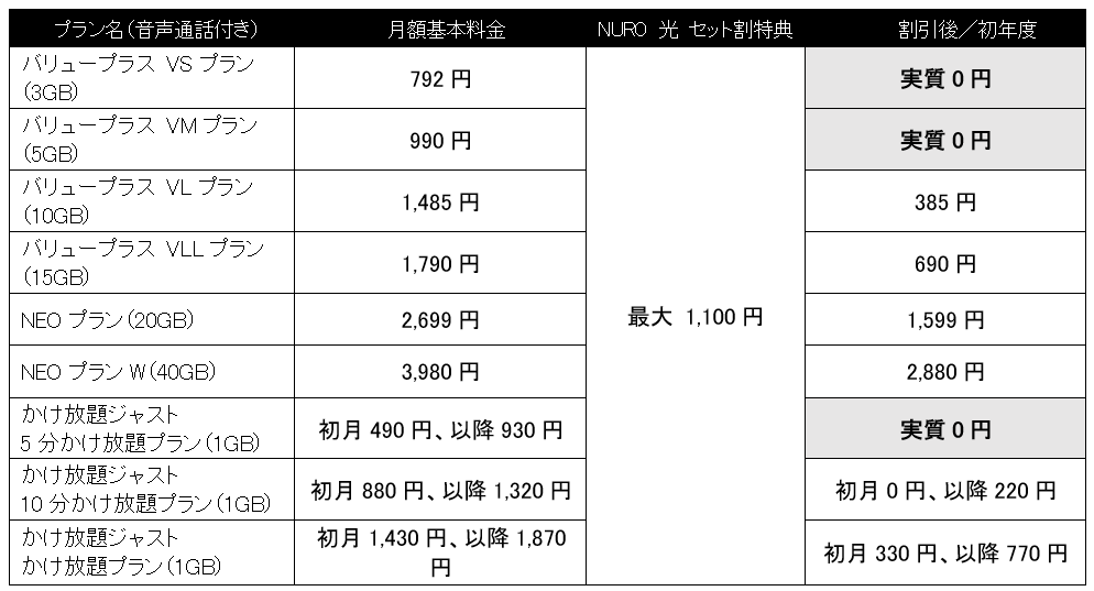 「NURO 光」新規申込で「NUROモバイル」新プラン5分かけ放題プランほか1年間実質0円で利用可能に