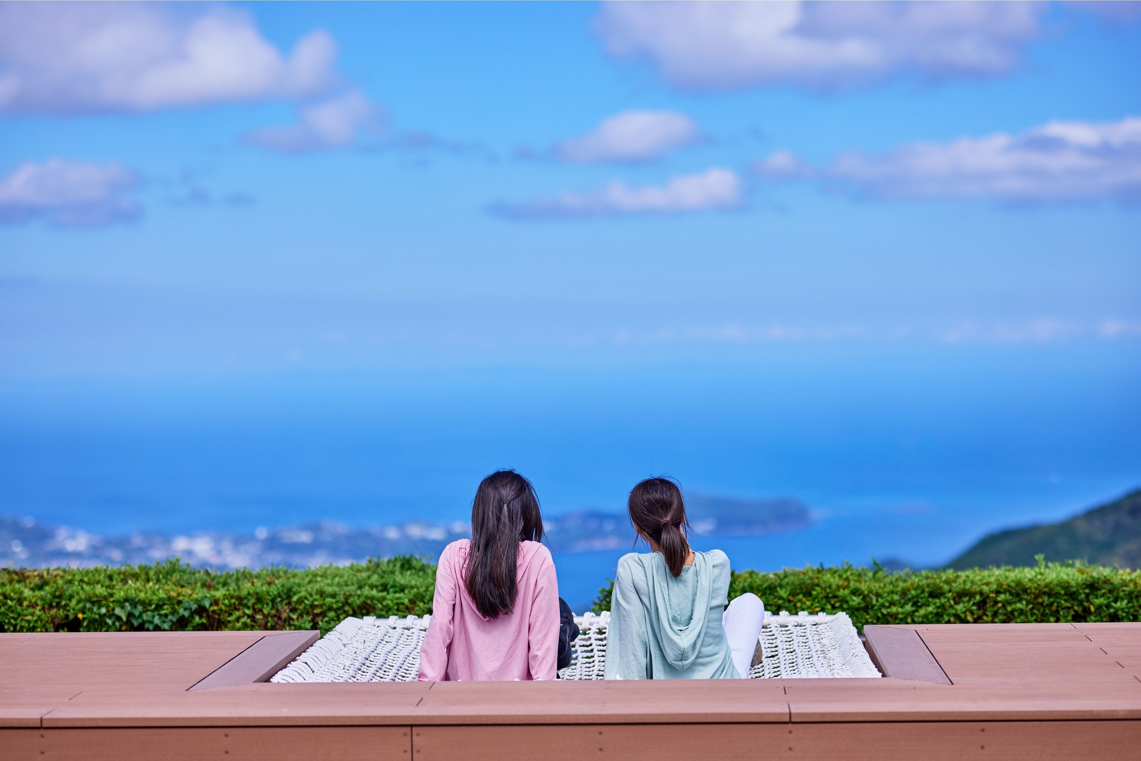 富士山をはじめ山々を一望できるデッキや、寝転びながら駿河湾や初島の景色を楽しめるハンモック付のデッキなど、十国峠山頂広場を囲むように設置された様々な形状のデッキから、目の前に広がる360°パノラマをお楽しみいただける展望テラスです。十国峠の文字を象った巨大モニュメント、“十の国”を指す矢印モニュメントなど、多数のフォトスポットがあります。