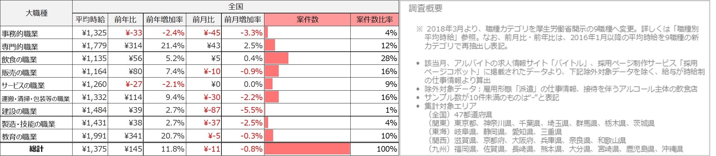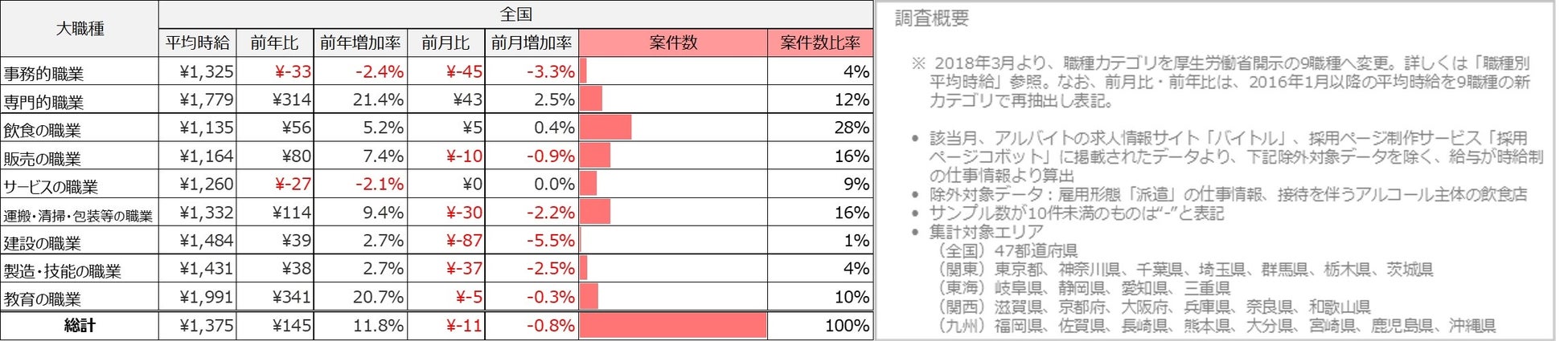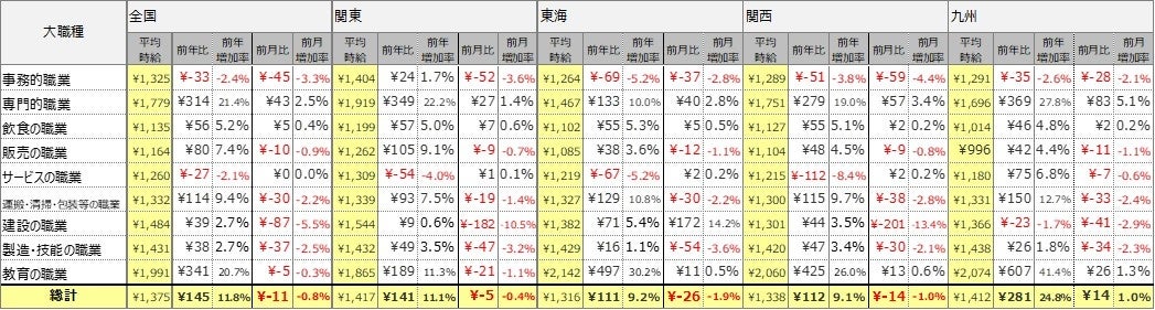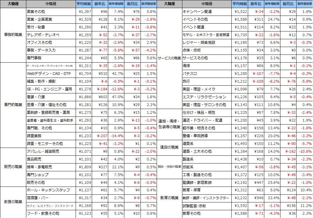 職種別の平均時給は、9職種中7職種の大カテゴリが前年を上回りました。事務的職業は1,325円(前年比33円減、前月比45円減)、専門的職業は1,779円(前年比314円増、前月比43円増)、飲食の職業は1,135円(前年比56円増、前月比5円増)、販売の職業は1,164円(前年80円増、前月比10円減)、サービスの職業は1,260円(前年比27円減、前月比±0円)、運搬・清掃・包装等の職業は1,332円(前年比114円増、前月比30円減)、建設の職業は1,484円(前年比39円増、前月比87円減)、製造・技能の職業は1,431円(前年比38円増、前月比37円減)、教育の職業は1,991円(前年比341円増、前月比5円減)となりました。