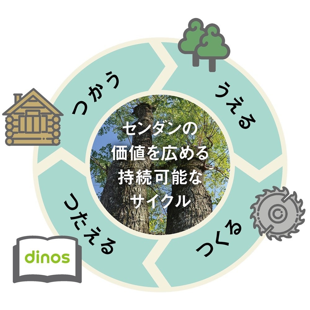 ディノスでは、これまで10年以上にわたり国産の杉やひのき材を活用した家具をお客様に提供してきました。今回、「山を守り、未来へとつなぐ」をテーマとして、国産材であるセンダンにスポットを当てたサステナブルなものづくりに取り組むことで、今後も継続的に、森林循環や林業活動を活性化する試みにも積極的に関わりながら、お客様のライフスタイルに寄り添ったアイテムをお届けしたいと考えます。