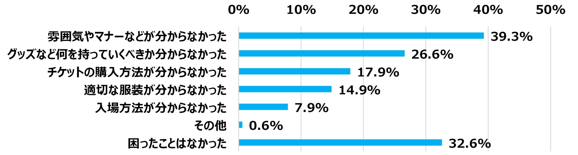 初めてライブ・ビューイングに行った際の困ったことをお聞きしました。最も多い回答は「雰囲気やマナーなどが分からなかった」で39.3%となりました。近年ではコロナ禍ということもあり、どのように応援して良いのかなど心配になってしまう人がいるのかもしれません。一方で、3人に1人は「困ったことはなかった」と回答していることがわかります。馴染みのある映画館で実施されているため、初めてでも不安に感じることなく参加している方もいるようです。