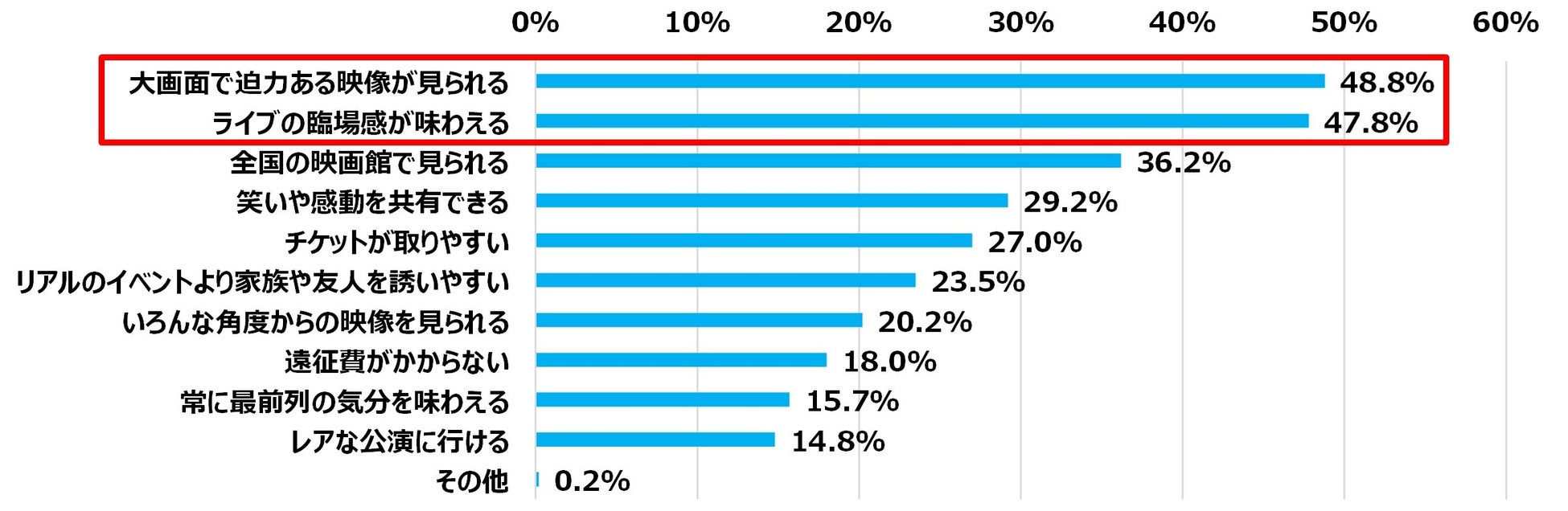 ライブ・ビューイングのメリットだと思うことは、「大画面で迫力ある映像が見られる」48.8%、「ライブの臨場感が味わえる」47.8%が上位。