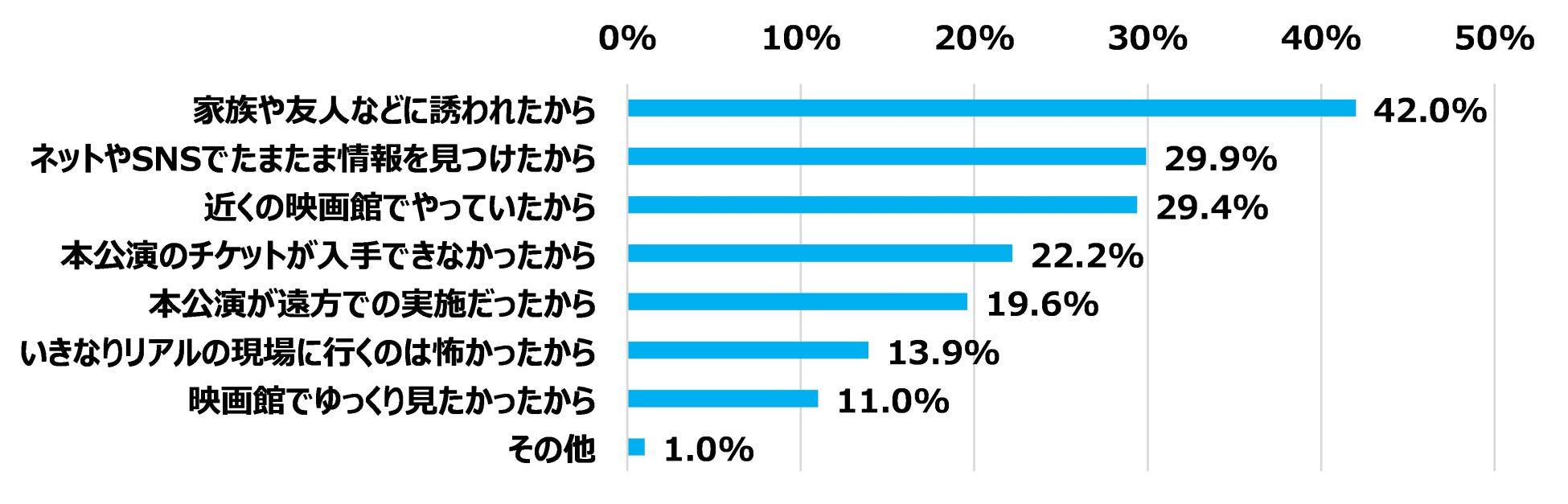 きっかけは「家族や友人に誘われたから」が最も多く42.0%、次いで「ネットやSNSでたまたま情報を見つけたから」29.9%、「近くの映画館でやっていたから」29.4%。