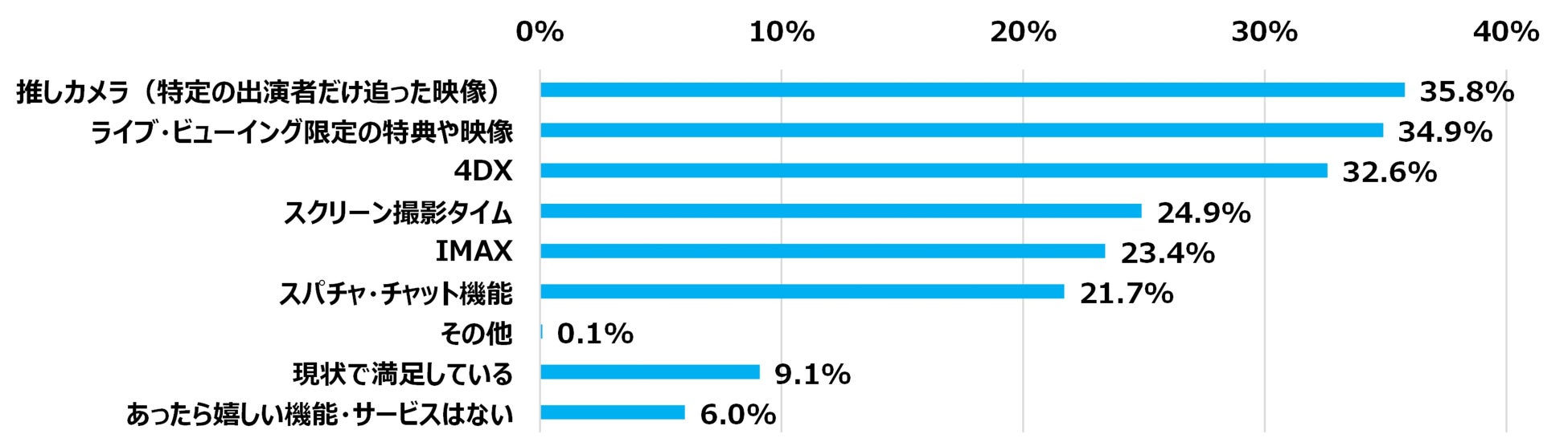 あったら嬉しい機能・サービスは、1位「推しカメラ」35.8%、2位「ライブ・ビューイング限定の特典や映像」34.9%、3位「4DX」32.6%。