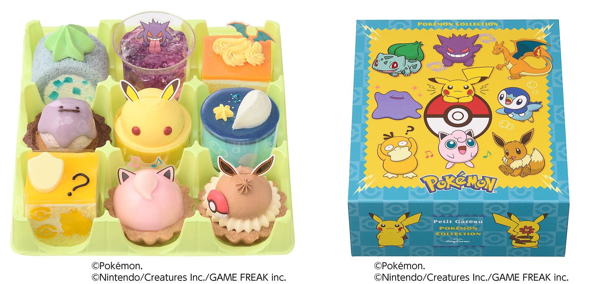 「ポケモンコレクション(9個入)」は、ポケモンたちをタルトやロールケーキ、ゼリーなど9種類のプチケーキで表現しました。「<ピカチュウ>プリン風味ケーキ」は、ピカチュウをイメージしたおひとりさまサイズのケーキです。みんなで楽しめるギミックが付いた「<ポケモン>パーティーBOX」など焼菓子ギフト3品は、手土産やプレゼントにも最適です。