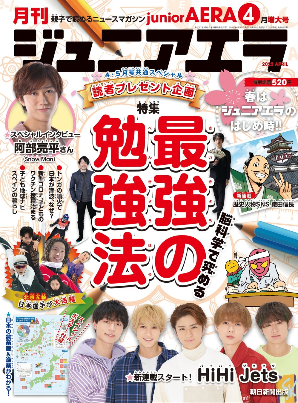 小中学生向けニュース月刊誌「ジュニアエラ4月号」は3月15日(火)発売。Snow Manの阿部亮平さんが、主演映画「おそ松さん」についてたっぷり語りました。さらに、ジュニアエラ恒例の子どもたちからの質問にも“お兄さん”として答えてくれました。また、この号から、HiHi Jetsの新連載「放課後はまかせて! HiHi JetsにQuestion」がスタートします。初回はメンバー5人全員で座談会です。この号の特集は「最強の勉強法」。脳科学に基づくエビデンスをもとに、どのように勉強に取り組むとより効率的かを考えました。新年度スタートにピッタリの内容です。学びも楽しさも詰まった一冊、ぜひご覧ください。