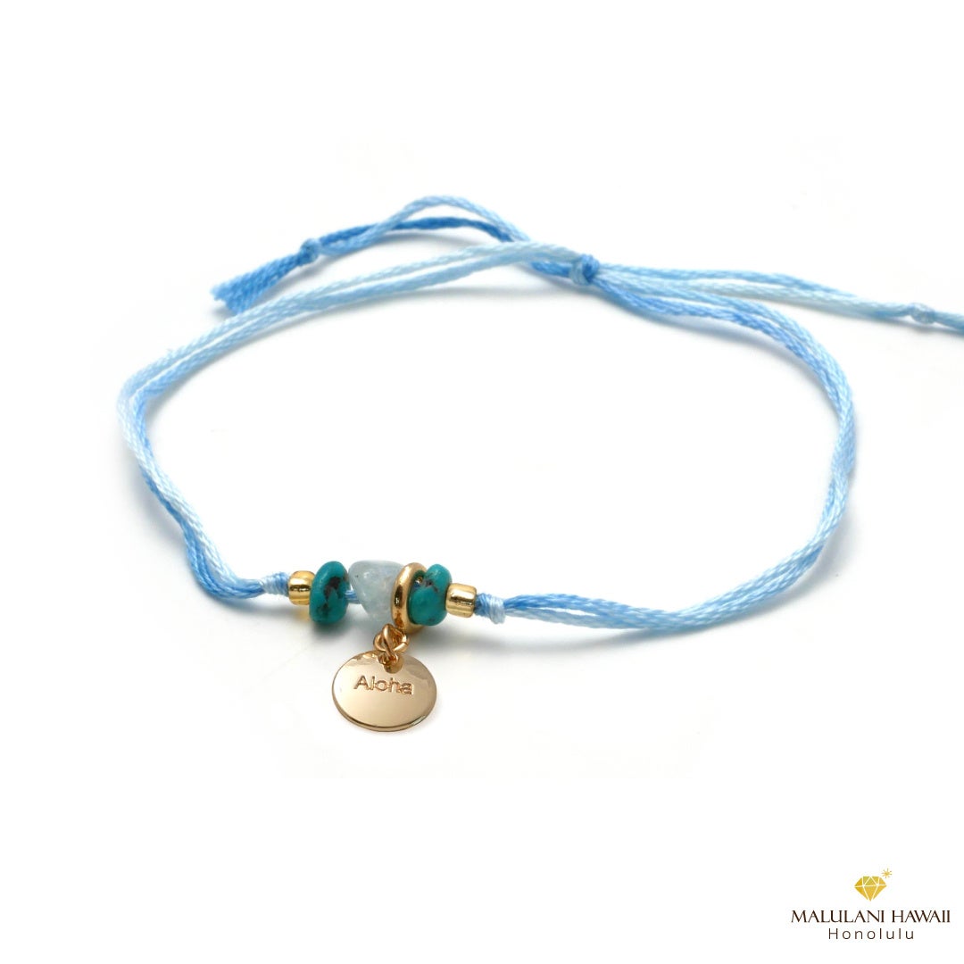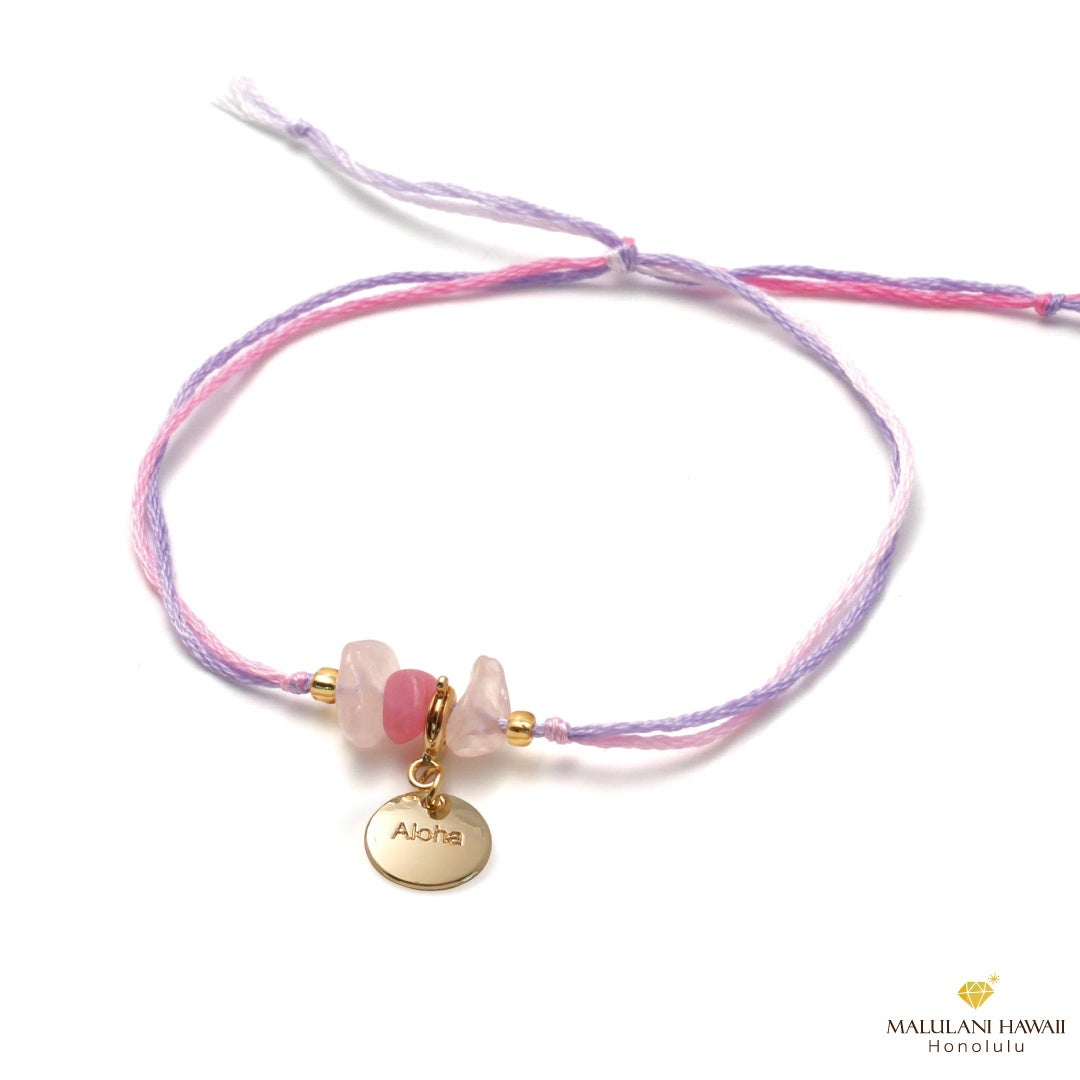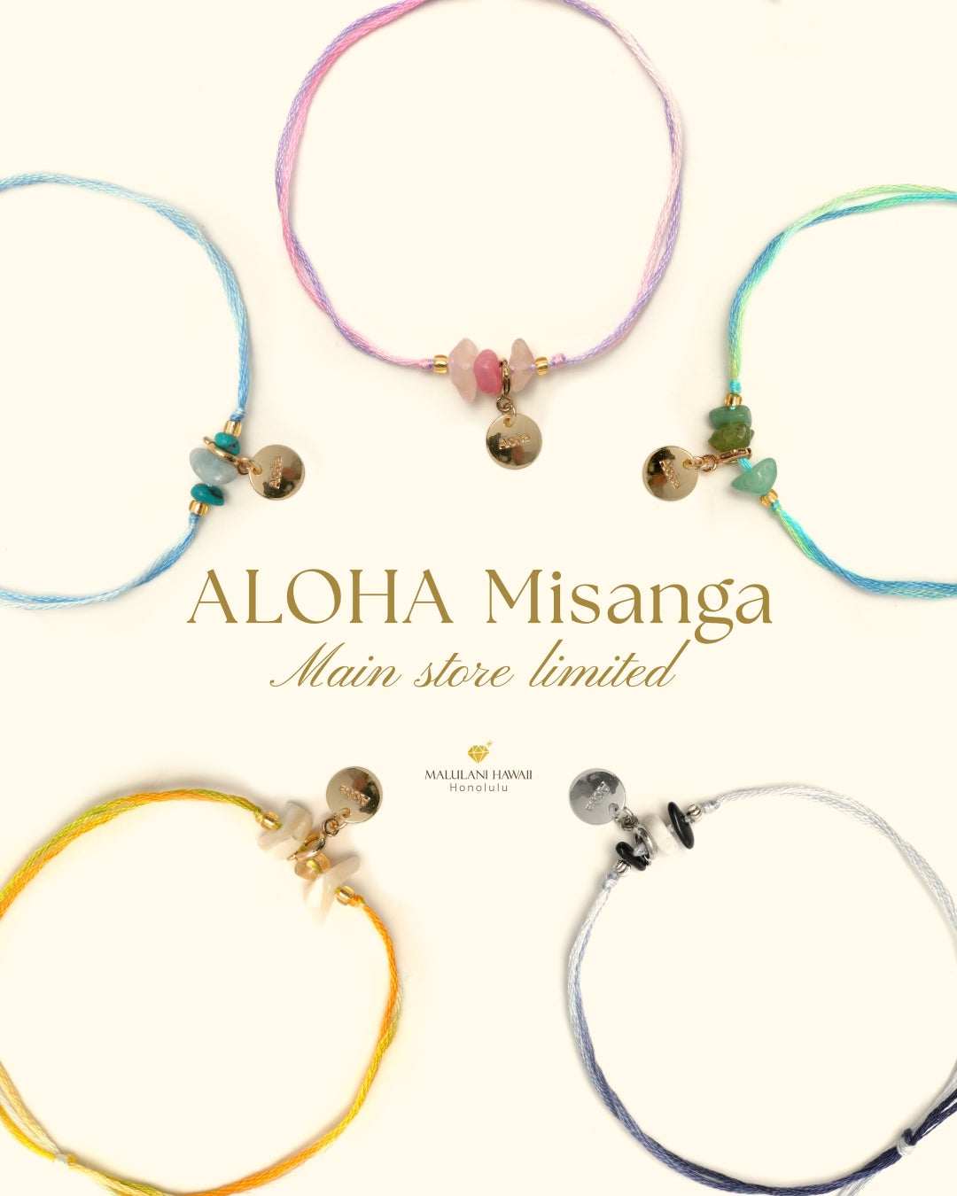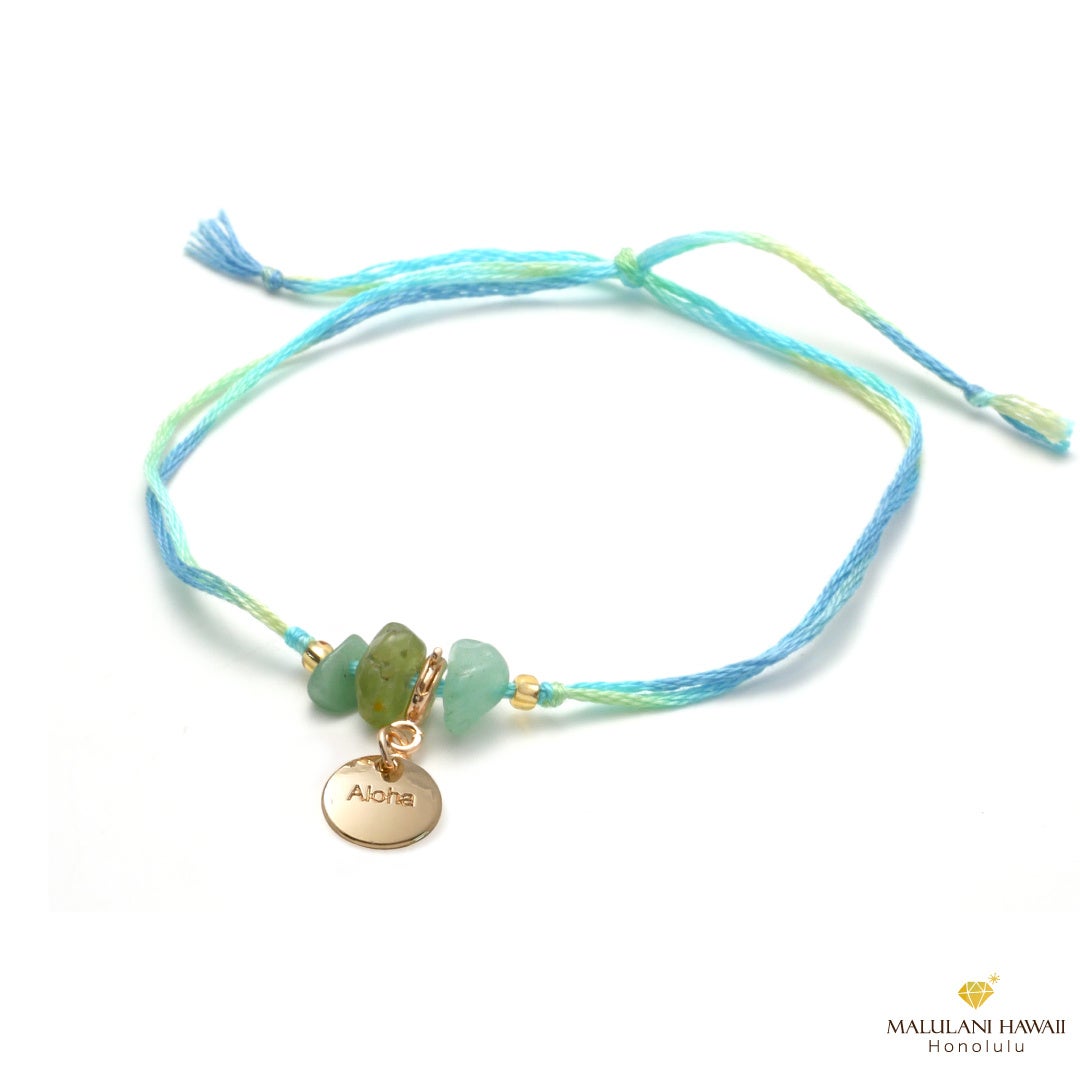 「ALOHA」と刻まれたチャームと、幸運を願う天然石で組み上げられたミサンガは、プレゼントにもぴったり。