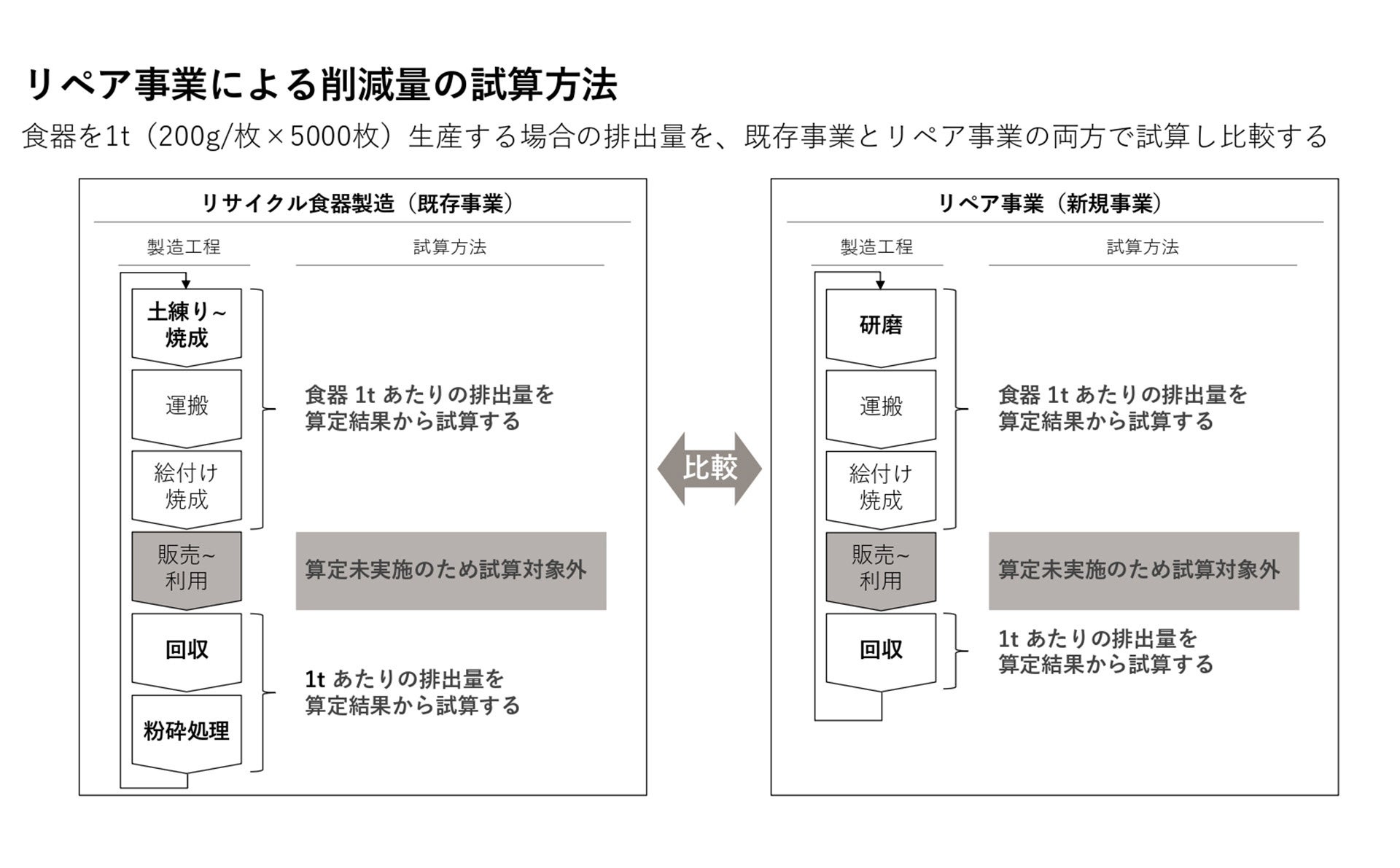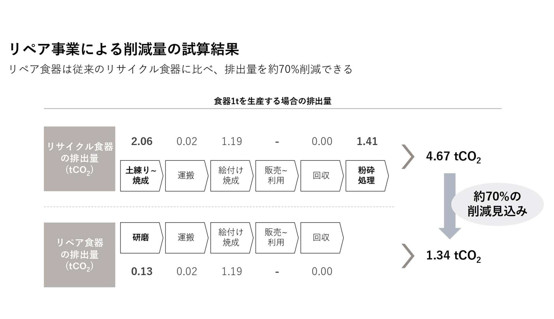 食器を1t(200g/枚×5000枚)生産する場合の排出量を、リサイクルした場合とリペアした場合の両方で試算し比較すると、従来のリサイクル時は4.67(tCO2/t)、リペア時は1.34(tCO2/t)と約70%もの大きな削減ができていることが、環境省脱炭素経営促進モデル事業にて、算定されています。