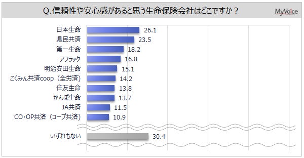 信頼性・安心感があると思う生命保険会社は(複数回答)、「日本生命」「県民共済」が各20%台、「第一生命」「アフラック」「明治安田生命」などが各10%台となっています。