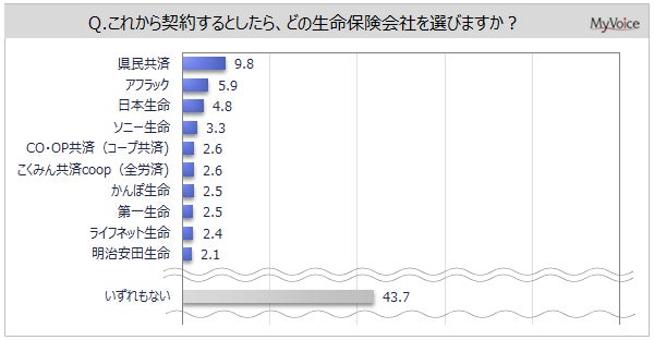 最も契約したいと思う生命保険会社は、「県民共済」が9.8%、「アフラック」が5.9%、「日本生命」が4.8%、「ソニー生命」が3.3%です。