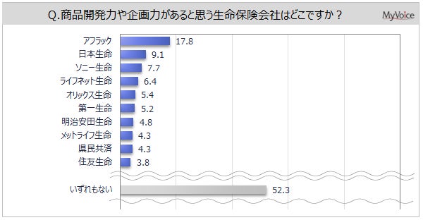 商品開発力・企画力があると思う生命保険会社は(複数回答)、「アフラック」が17.8%、「日本生命」「ソニー生命」「ライフネット生命」が6~9%となっています。「いずれもない」が5割強です。