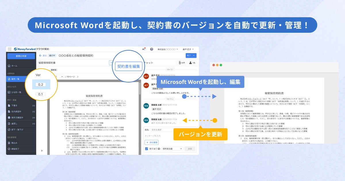 本機能は、契約書のバージョン管理を簡単に行える機能です。『マネーフォワード クラウド契約』上にアップロードした契約書は、案件詳細画面から、PCのローカルにあるMicrosoft Wordを自動で起動し、編集することができます。編集したWordファイルを保存すると、クラウド上にも最新バージョンの契約書として自動保存されます。これにより、契約書の内容変更や修正の度に発生していた、ファイルのアップロード・ダウンロードが不要になります。