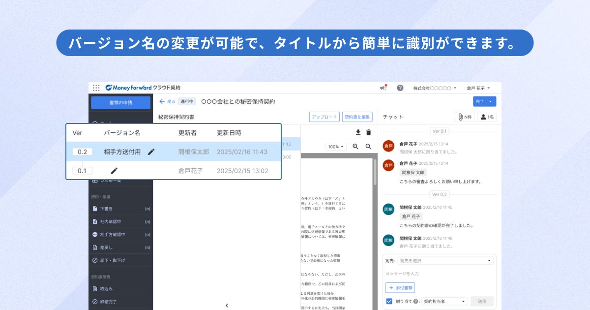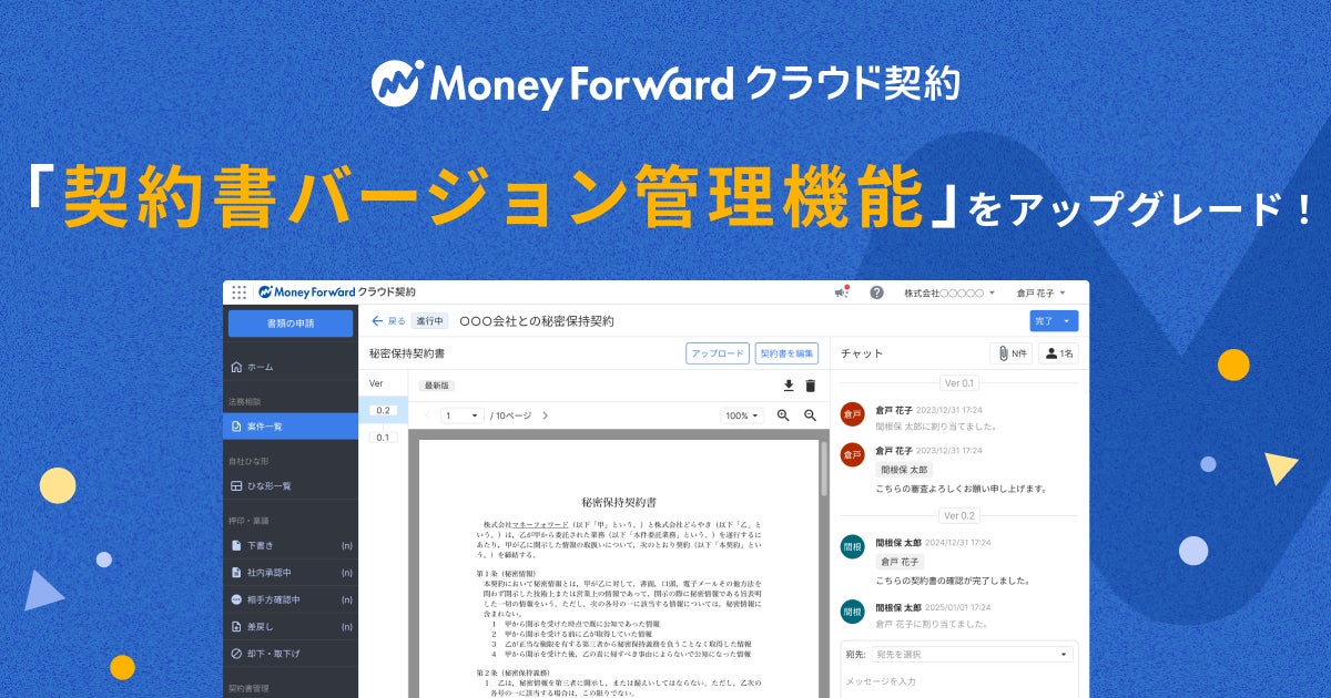 株式会社マネーフォワードは、『マネーフォワード クラウド契約』の法務相談画面において、「契約書バージョン管理機能」をアップグレードしました。これにより、常に最新バージョンの契約書を簡単に管理でき、最新のファイルを探す手間やファイル取り違えのリスクを削減し、契約業務の効率化を実現します。