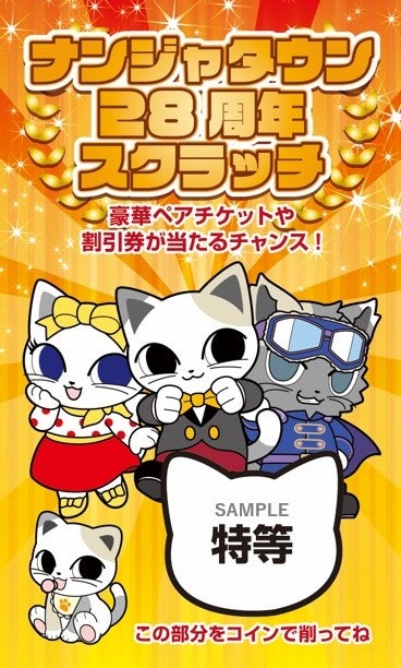 また、ナンジャタウン内のグッズショップ「ナジャモジャマーケット」や飲食エリア「ナンジャ餃子スタジアム」「福袋デザート横丁」で1会計につき500円購入ごとにスクラッチカード1枚を配布する「ナンジャタウン28周年スクラッチ」を実施。ナンジャパスポートのペアチケット引換券やサンシャイン水族館ペアチケット引換券などが抽選で当たります。