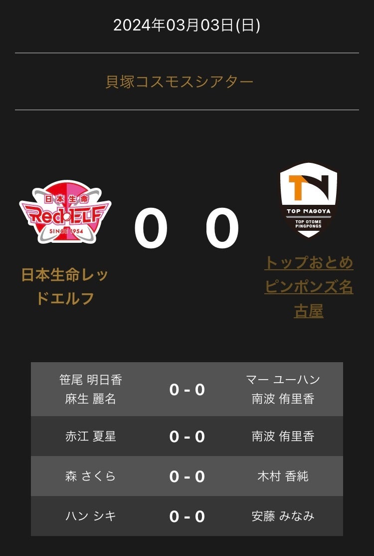 ノジマTリーグ 2023-2024シーズン 公式戦 3月3日開催 日本生命レッドエルフvsトップおとめピンポンズ名古屋 対戦オーダー発表