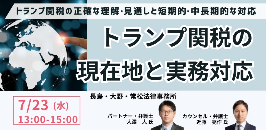 JPI(日本計画研究所)は、長島・大野・常松法律事務所 パートナー・弁護士 大澤 大 氏、カウンセル・弁護士 近藤 亮作 氏を招聘し、トランプ関税の現在地と実務対応について詳説いただくセミナーを開催します。
