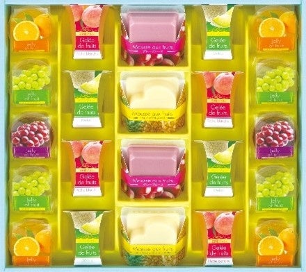 【内容】 ゼリー(オレンジ×4・マスカット×4・グレープ×2)各75g、ジュレ(白桃・メロン)各120g×各4、ムース(グレープ・パイナップル)各90g×各2の詰め合わせセットです。