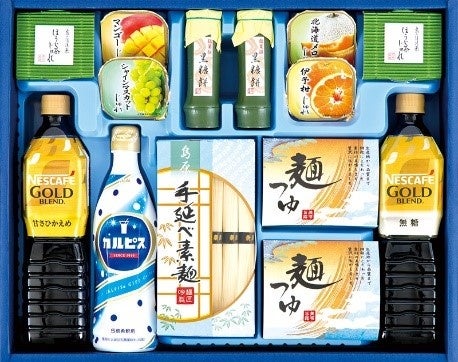 【内容】 カルピス470ml、手延素麺300g、麺つゆ(濃縮)(12ml×4袋)×2、ほうじ茶じゅれ72g×2、黒糖餅68g×2、じゅれ(シャインマスカット・北海道メロン・伊予柑・マンゴー)各65g、ネスカフェゴールドブレンド(無糖・甘さひかえめ)各720mlの詰め合わせセットです。