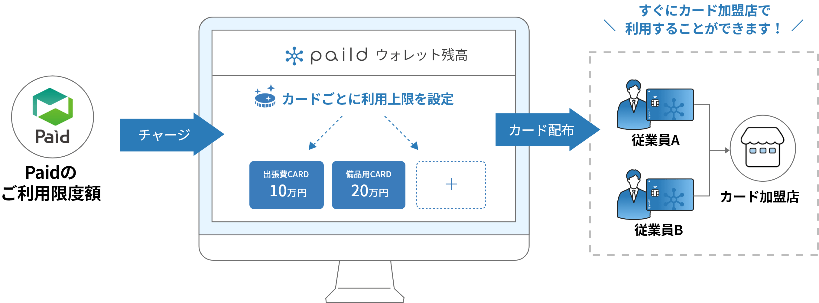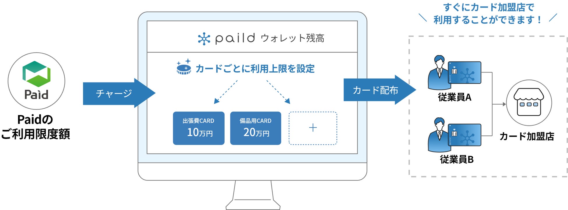 「paild(ペイルド)」でウォレットを開設後、「Paid」の利用限度額から「paild(ペイルド)」ウォレットへのチャージをします。カードは複数枚発行が可能で、ウォレットにチャージされた金額はカードごとに利用上限額を振り分けて設定できます。チャージ完了後はカードの加盟店でカード決済が可能になります。通常チャージは事前に銀行振り込みが必要ですが、「Paid」×「paild(ペイルド)」の仕組みであれば後払いでチャージできるので、銀行の振込手数料や着金のタイミングを気にすることなく、スムーズにカードを利用することができます。