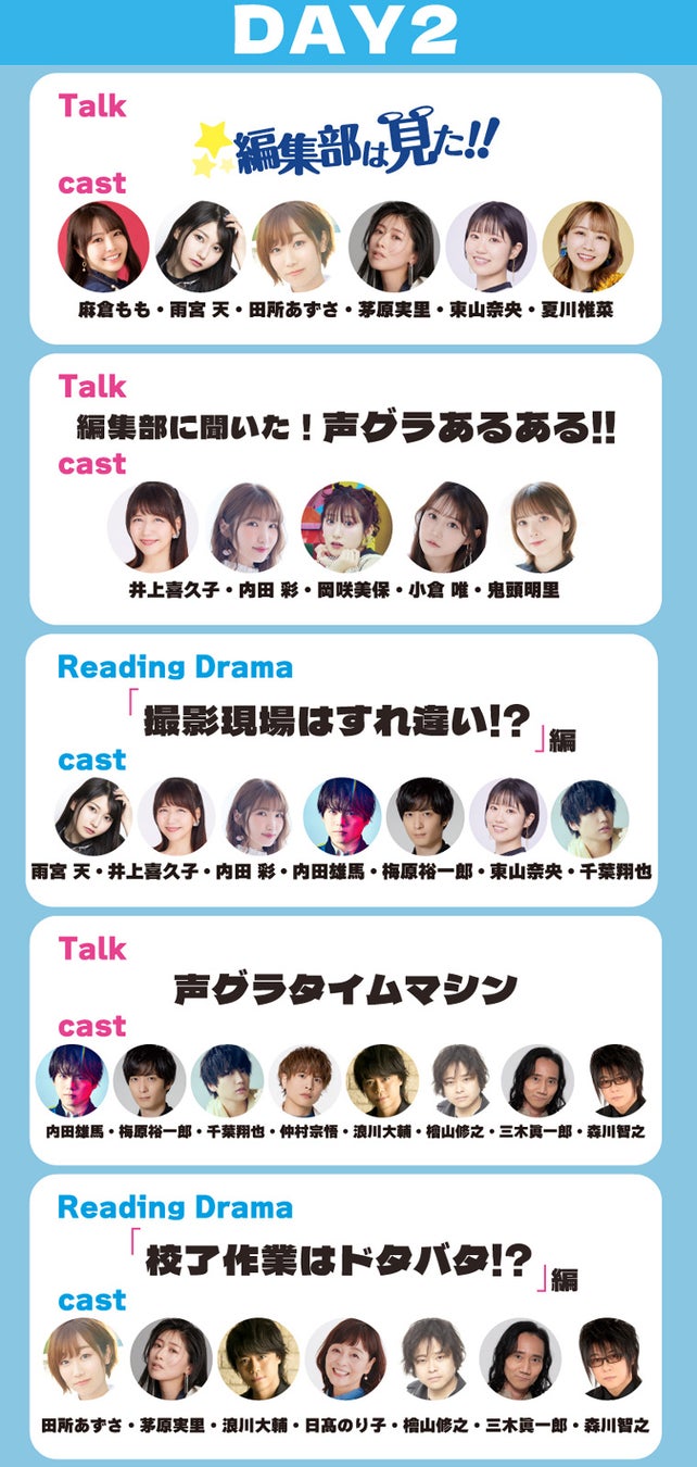 麻倉もも / 雨宮天 / 井上喜久子 / 内田彩 / 内田雄馬 / 梅原裕一郎 / 岡咲美保 / 小倉唯 / 鬼頭明里 / 田所あずさ / 千葉翔也 / 茅原実里 / 東山奈央 / 仲村宗悟 / 夏川椎菜 / 浪川大輔 /日髙のり子 / 檜山修之 / 三木眞一郎 / 森川智之 /[司会]松澤ネキ / [司会]森川智之