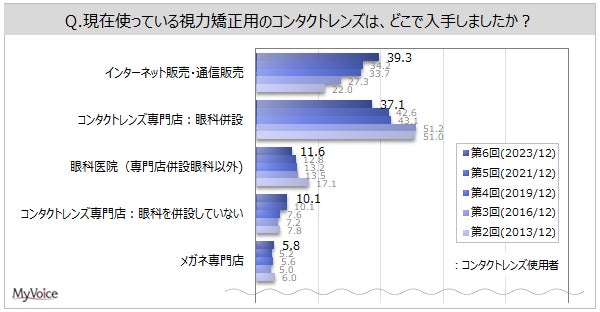 過去調査と比べて「インターネット販売・通信販売」は増加傾向で、減少傾向の「コンタクトレンズ専門店:眼科併設」を上回っています。