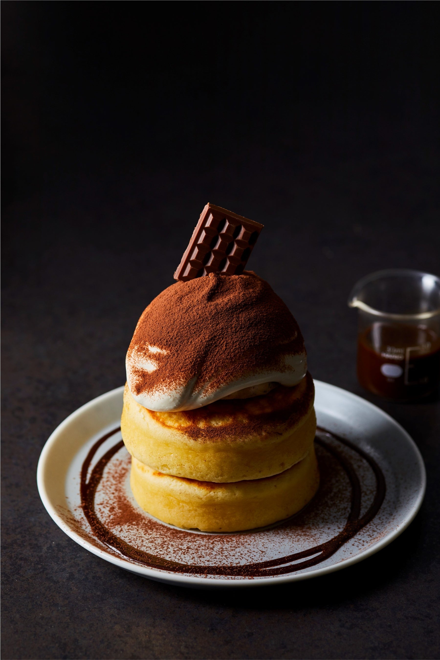 外はさくっ、中はしっとりしたビスケットのような食感のホットケーキにクッキー&クリームアイスとなめらかで口溶けの良いマスカルポーネクリーム、ココアパウダー、チョコレートをトッピングしました。エスプレッソチョコソースをかけてよりティラミスを感じられる味わいに仕上がります。