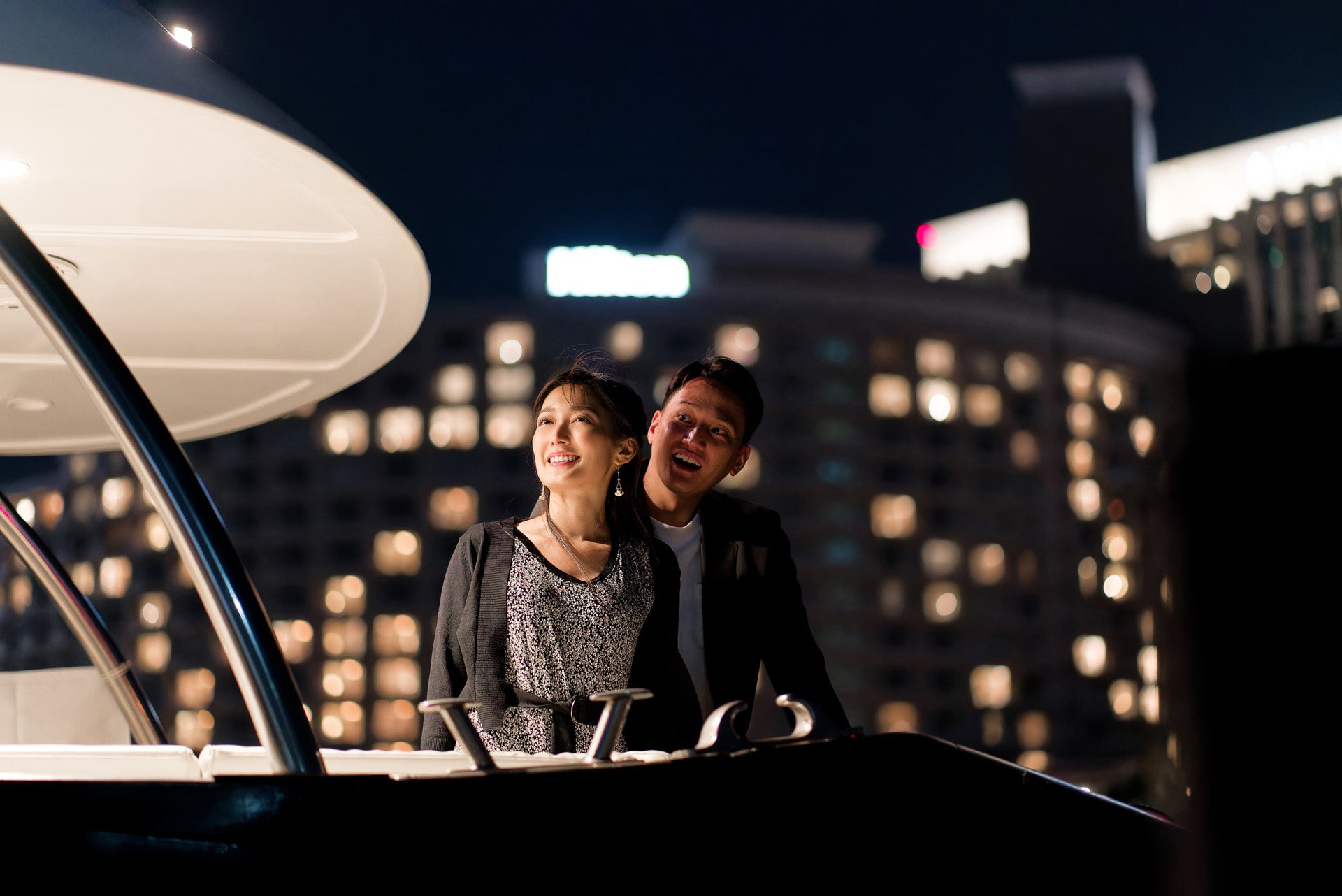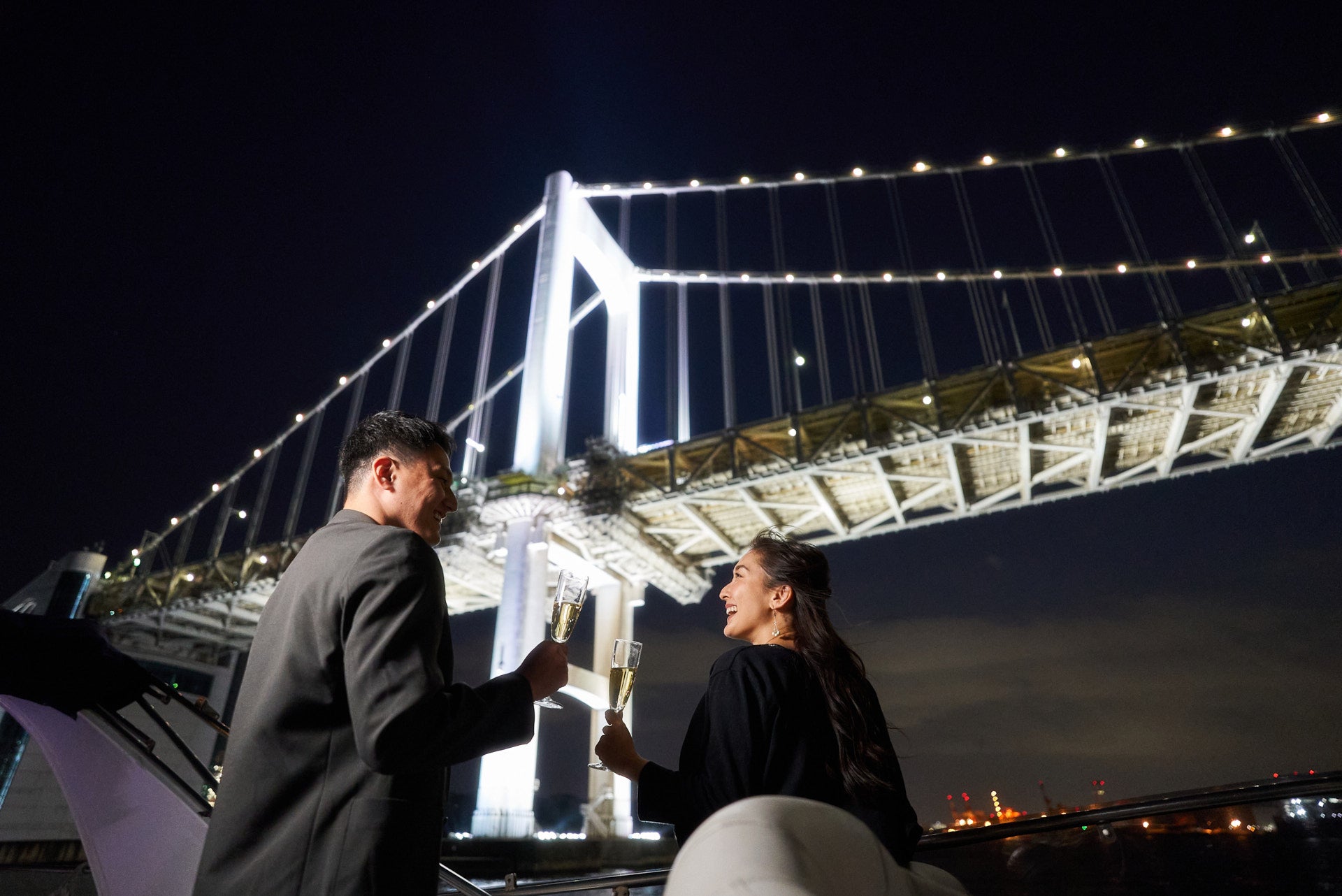 プロポーズの舞台となるクルーズ船は株式会社ケーエムシーコーポレーションが保有する黒と白のツートンカラーが海上にも映える「MYⅢ(エムワイスリー)」。キャビンやデッキをはじめ、開放感のあるフライブリッジを備えています。ホテルからほど近いお台場海浜公園の桟橋から出航し、サンセットから夕焼け後のわずかな時間に訪れる深い青色のブルーモーメント、夜の街並みが光を灯し始める景色の移り変わりをご覧いただきながらレインボーブリッジや東京タワー®などといった東京の絶景を周遊するコースを運航します。なかでも、レインボーブリッジを真下から眺めながらくぐる瞬間は、クルージングならではの非日常的な体験で、お二人のムードをさらに高めてくれるはず。