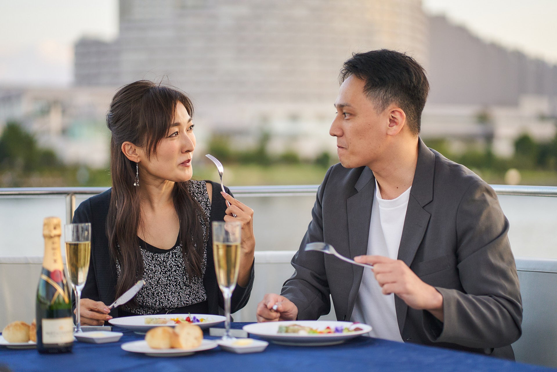 「クルーズプロポーズプラン」は、お二人だけが乗船するプライベートクルーズでロマンチックなプロポーズが叶う、海を間近に臨むヒルトン東京お台場ならではのラグジュアリーなプランです。本プランでは、約3時間のクルーズと、ヒルトン東京お台場のシェフが船上で仕上げるスペシャルディナーコースがセットになっております。お料理は、「海の幸と彩り野菜のテリーヌ トマトクーリー」から始まる全5品で、メイン料理には「黒毛和牛ホホ肉の赤ワイン煮込み」をご用意しています。さらに、ハーフボトルシャンパンにビールやワインなどのフリーフロー付です。