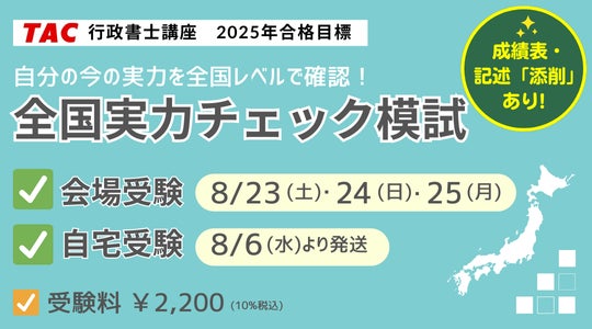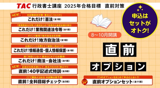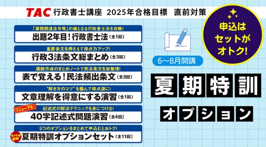 行政書士試験対策講座を展開しているTAC株式会社(東京都千代田区、代表取締役:多田敏男)は、2025年合格目標 直前対策として『夏期特訓オプション』『直前オプション』『全国実力チェック模試』を6月より順次開講します。