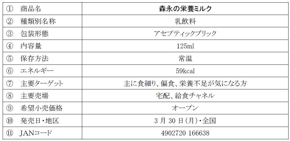 このたび発売する「森永の栄養ミルク」は、125mlの飲み切りサイズでコップ1杯(200ml)分のたんぱく質とカルシウムに加え、当社が独自に開発した健康力をサポートする「シールド乳酸菌®」や鉄分・食物繊維・マルチビタミンをバランスよく配合した小容量で効率よく不足しがちな栄養素が摂取できるミルクです。また、常温でも長期保存が可能なので賞味期限切れによる廃棄ロスの心配が少なく、お取り置きにも便利で使いやすくなっています。ぜひお試しください。