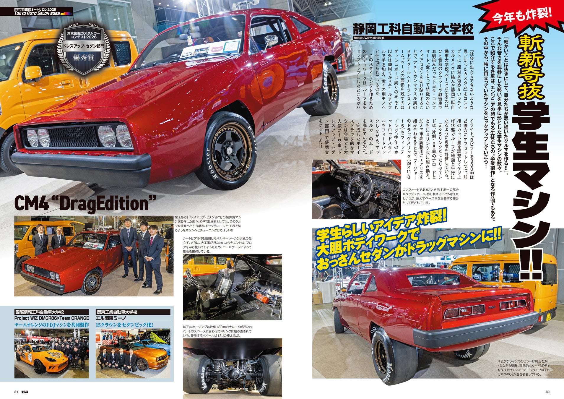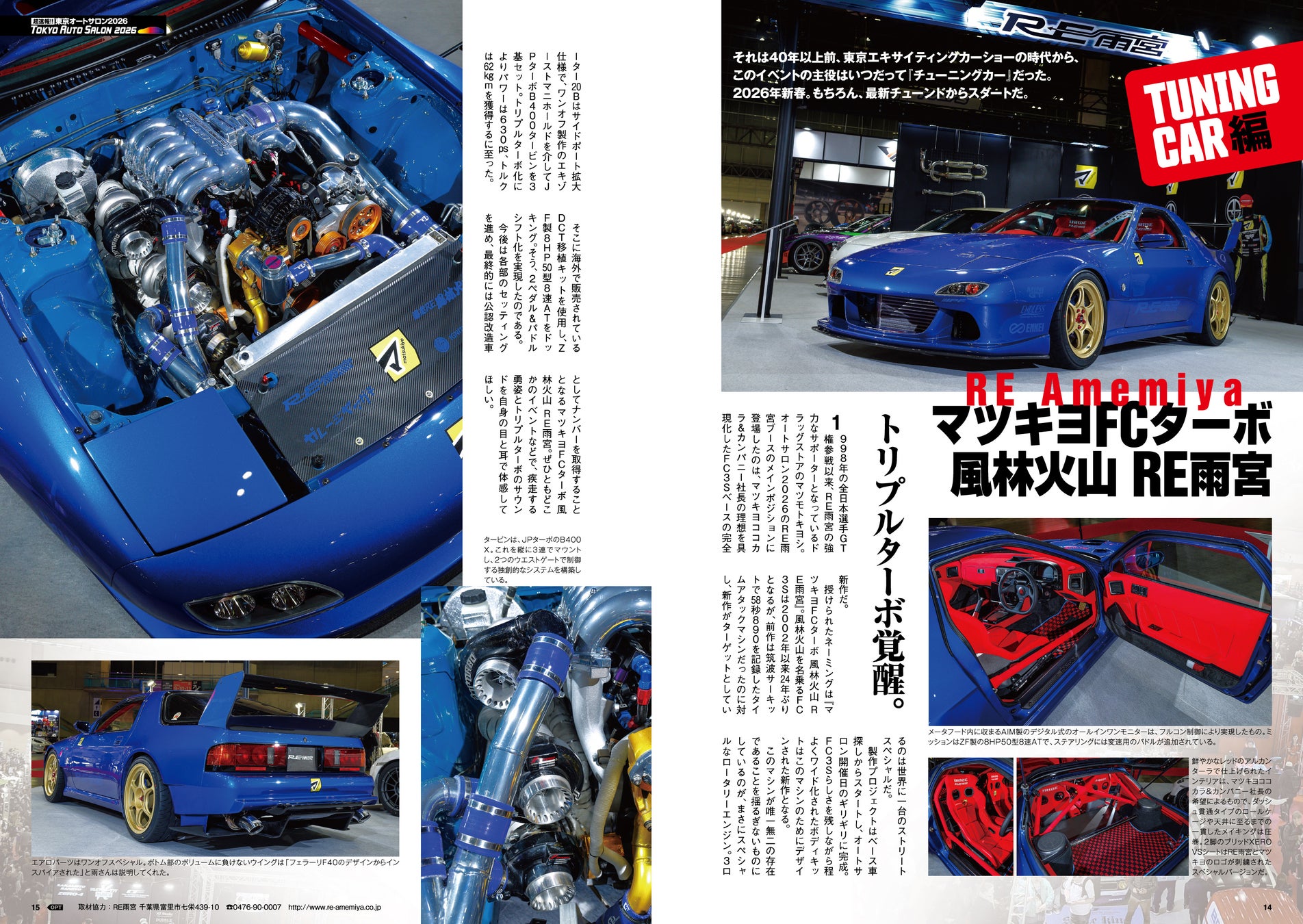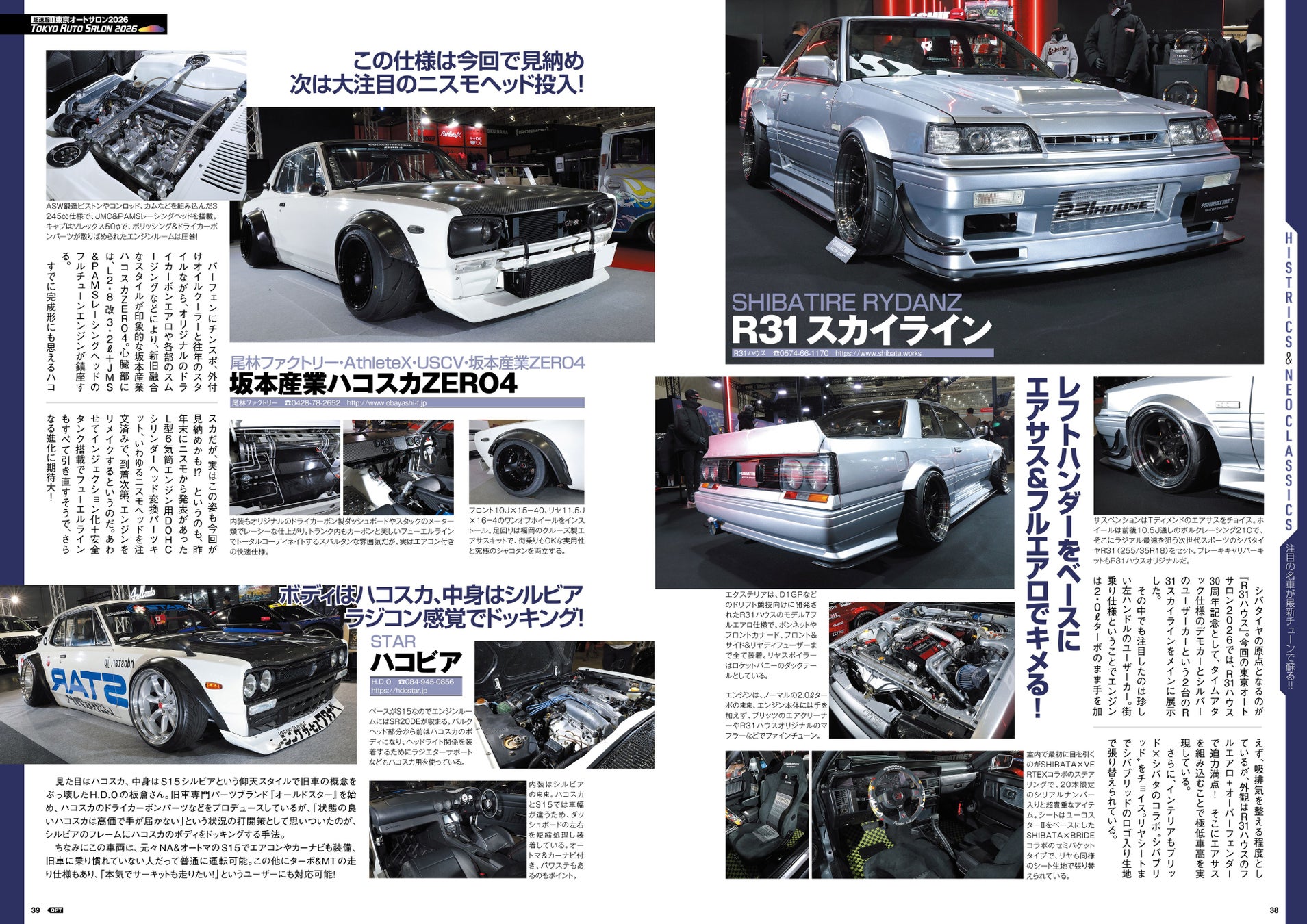 会場取材した多くの車両の中でも、OPT的にド直球のスポーツカーを巻頭でピックアップ。RE雨宮、トップシークレット、ガレージアクティブといった超人気ショップを始め、トラストやブリッツ、T&Eが製作した最新チューンドまで、その魅力をみっちり紹介している。
