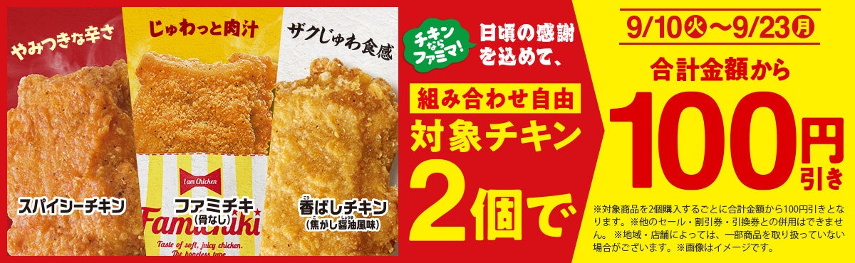 株式会社ファミリーマート(本社:東京都港区、代表取締役社長:細見研介)は、継続して取り組んでいる5つのキーワードの1つである「『あなた』のうれしい」」の一環として、2024年9月10日(火)から2週間、日頃の感謝を込めて、ファミチキ(骨なし)、スパイシーチキン、香ばしチキンの3種のうち組み合わせ自由で2個同時購入すると、レジにて100円引きとなる企画を全国のファミリーマート約16,300店で開催いたします。