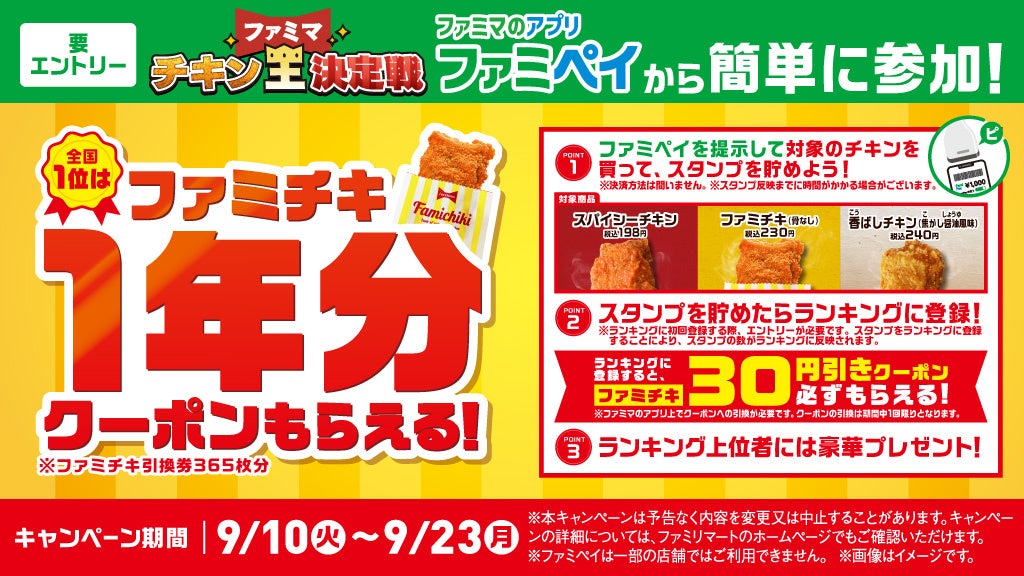 チキンセールと同時開催で、期間内にファミマのアプリ「ファミペイ」を提示して対象のチキンを購入した数を競う「ファミマチキン王決定戦」を実施いたします。ランキングに応じてファミチキ1年分クーポンなど、豪華プレゼントがもらえます。