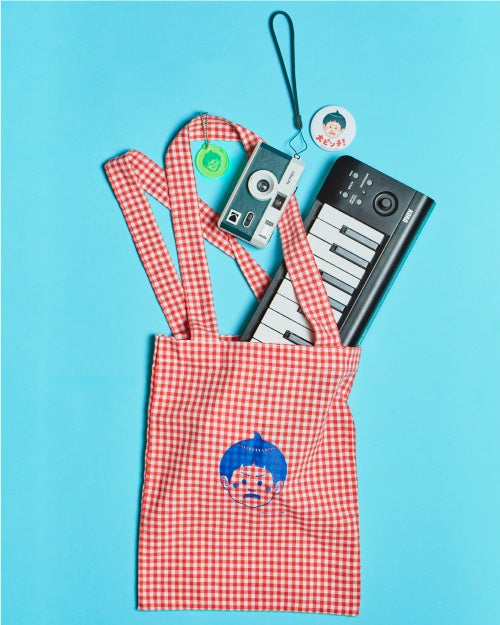「コットンバッグ」 男の子の顔と「!!」があしらわれたバッグ。肩掛けできる長さの持ち手で、A4サイズが入ります。(約27×34cm〈持ち手含まず〉) 1,980円