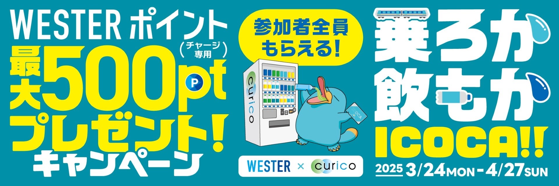 西日本旅客鉄道株式会社(大阪府大阪市北区、代表取締役社長 長谷川 一明)、株式会社ジェイアール西日本デイリーサービスネット(兵庫県尼崎市、代表取締役社長 中西 豊)は、 2025年3月24日(月)~4月27日(日)において、JRと駅ナカ自販機curicoを利用すると、参加者全員にWESTERポイント(チャージ専用)を最大500ptプレゼントするキャンペーンを実施します。この機会に便利な鉄道と駅ナカ自販機curicoをぜひご利用ください。
